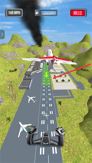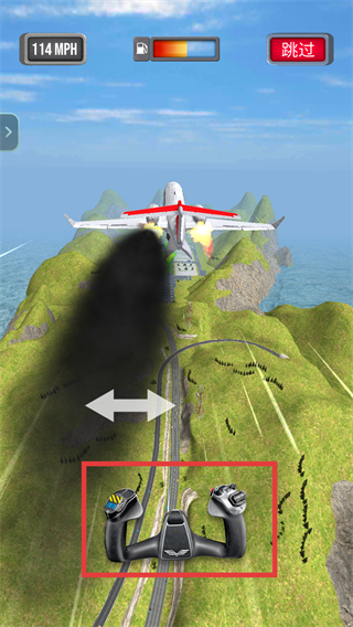 2、通过红框内的操控装置调整飞机方向,保持【114MPH】的速度,躲避障碍推进紧急着陆流程。