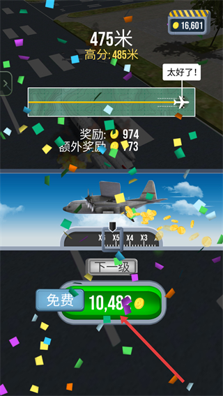 4、着陆成功后获得【得分-486米】与【974-奖励】,点击【免费】按钮领取奖励。