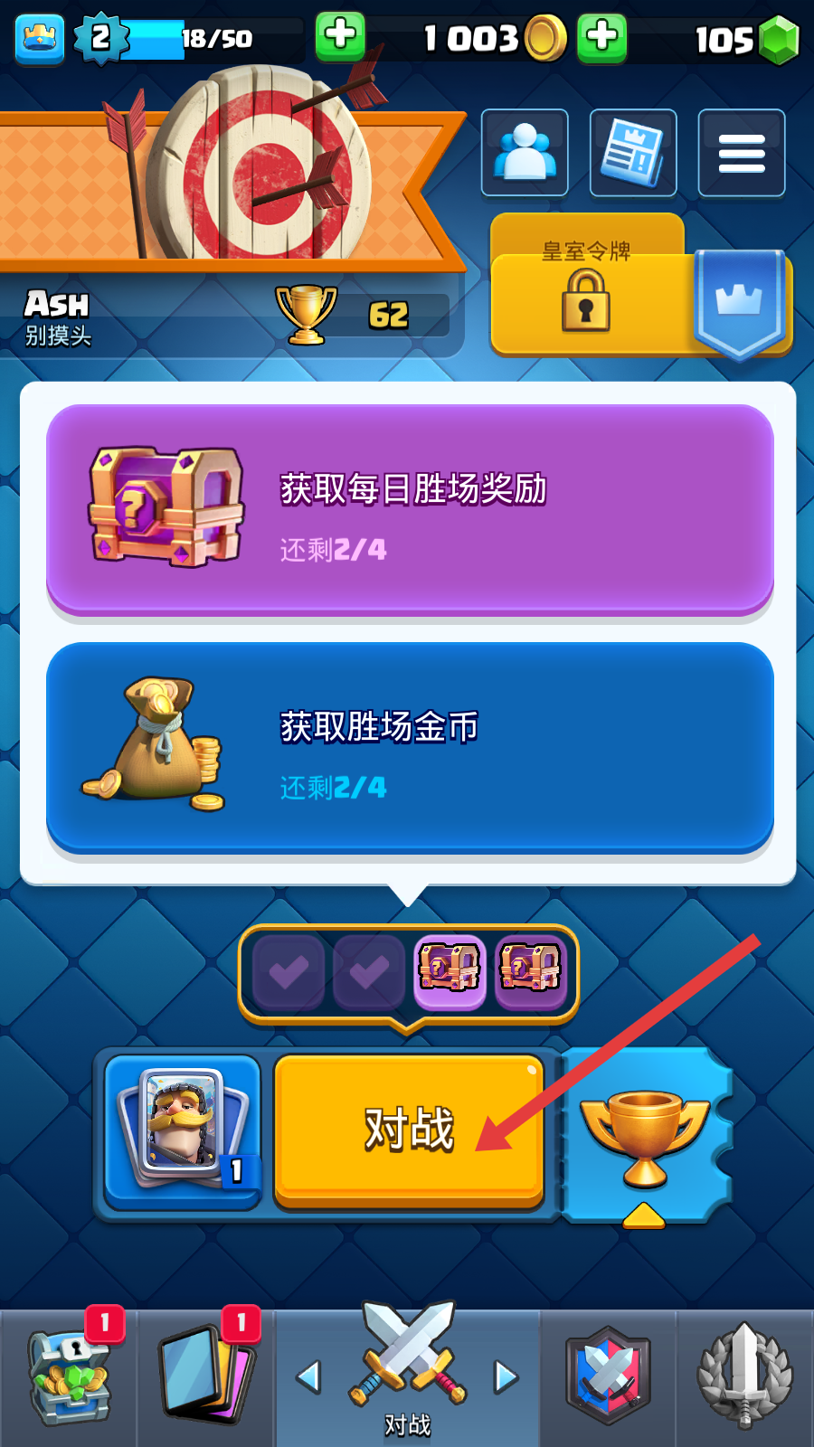 1、点击【对战】按钮参与战斗,完成【每日胜场奖励】和【胜场金币】的目标,获取宝箱与金币资源。