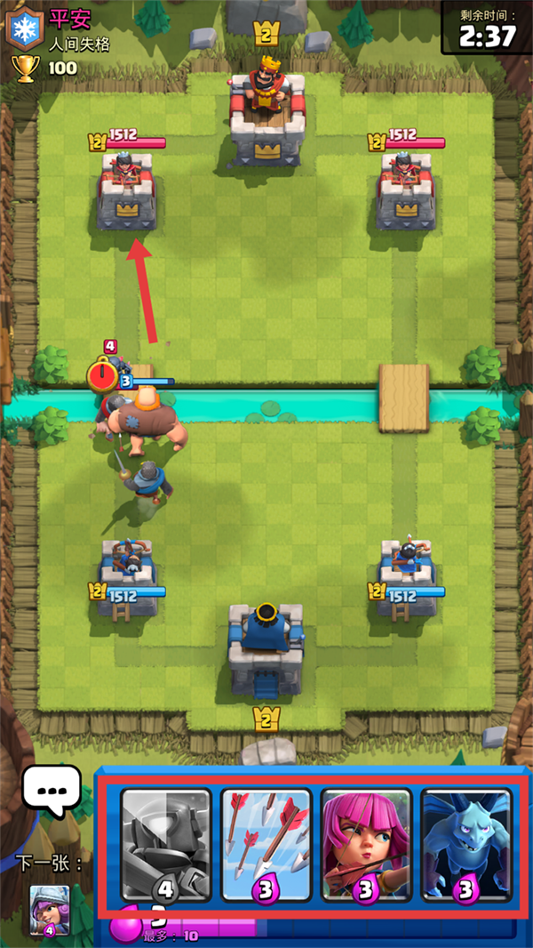 2、面对敌方进攻时,根据手牌选择合适卡牌应对,保护己方防御塔。