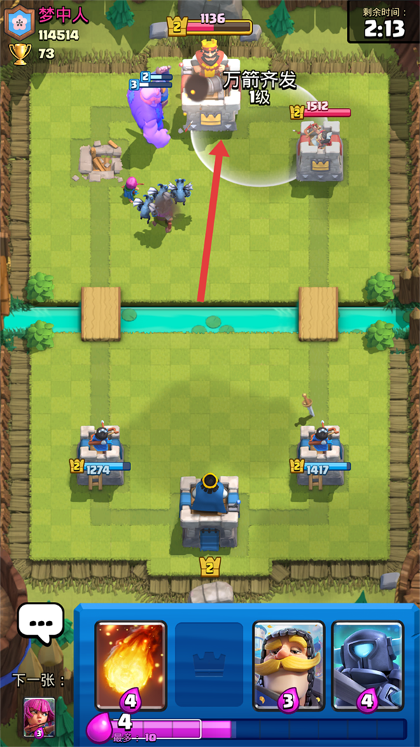 3、在对战中合理释放【万箭齐发】,针对敌方密集的单位或给予对方防御塔致命一击。