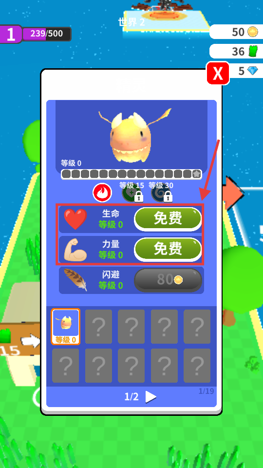 1、角色升级优先点击生命、力量的免费按钮,攒80金币升级闪避,增强角色能力。