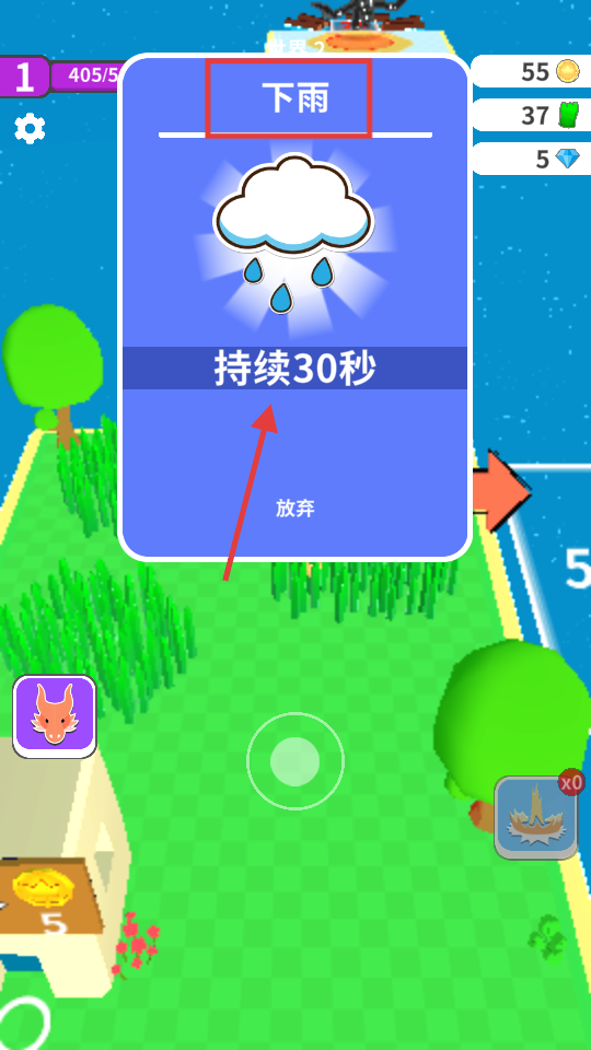 2、遇到下雨别点击放弃,等待30秒持续时间,助力资源收集或植物生长等收益获取。