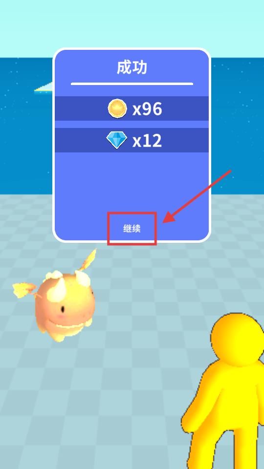 4、战斗成功后点击继续按钮,领取96金币加12钻石的奖励,继续探索小岛积累资源。