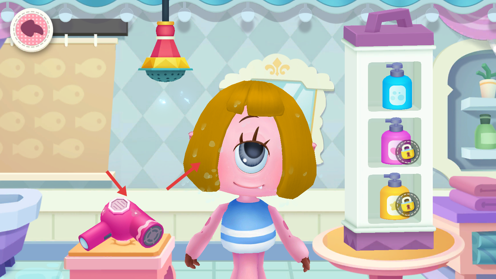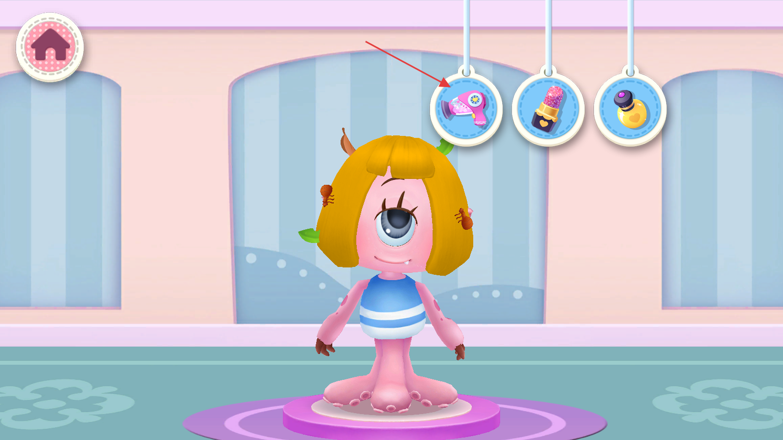 2、进入游戏后,能看到可爱的角色形象,上方有吹风机、口红、指甲油等不同美容工具选项,可根据需求选择。