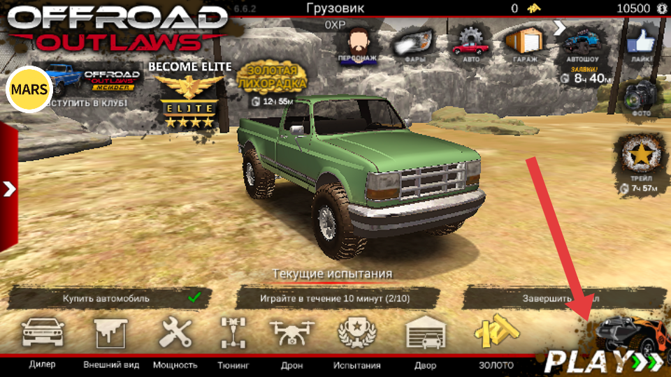 1、进入游戏后点击【PLAY】,选择车辆开始越野挑战,利用内置MOD菜单可获得车辆性能等优势。