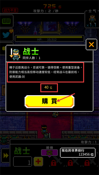 1、【战士】擅长近战-防御高速度慢-用重装备武器,花费【40-G】点击【購買】解锁该职业,可部署在前线作战。
