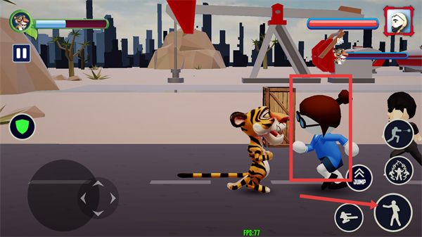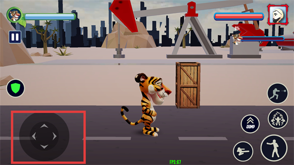 2、战斗中通过红框内的方向键控制老虎移动,搭配右侧【JUMP】等动作按钮,操控角色探索场景并接近目标。