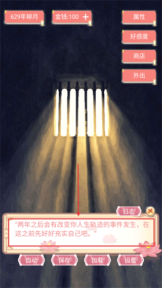 1、游戏开局提示两年后有重大事件,需尽早通过行程安排提升自身属性,为后续人生轨迹变化做好准备。