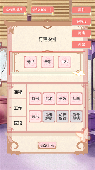 4、行程安排有诗书音乐书法等课程,可按目标选择对应项目定向提升属性,助力达成养成目标。