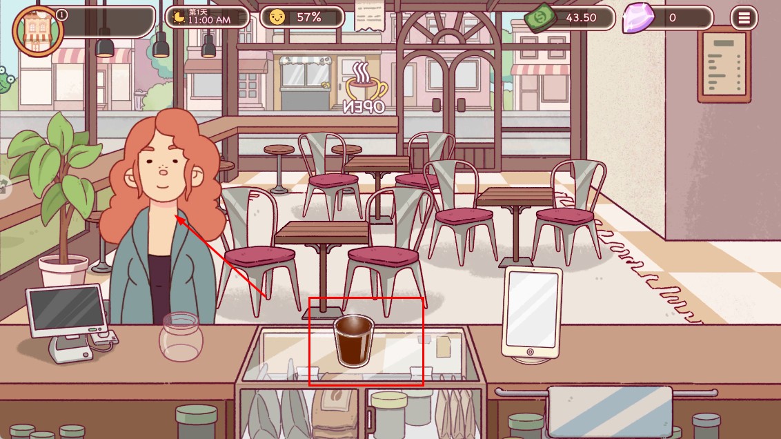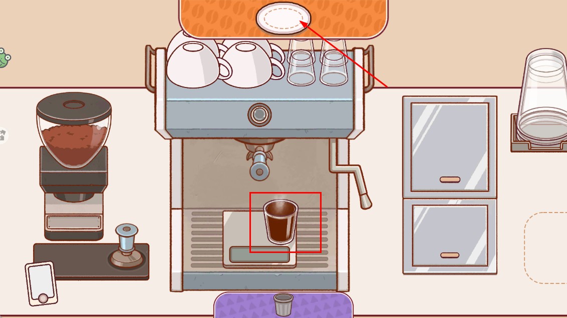 1、制作咖啡时,先将【咖啡杯】放于【咖啡机】下方,启动机器完成基础咖啡制作,为后续调配做准备。