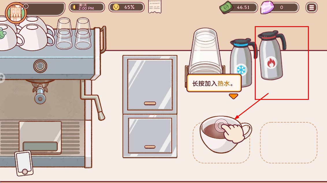 3、调配咖啡时,长按【热水壶】往盛有咖啡的【杯子】中加入热水,调整饮品浓度以满足顾客需求。
