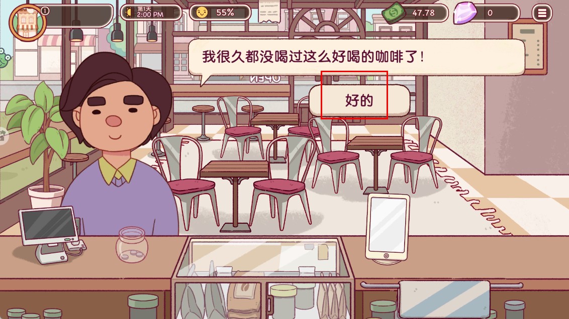 4、顾客品尝咖啡后会给出评价,点击界面中的【好的】按钮回应顾客,维持良好互动并推进游戏流程。