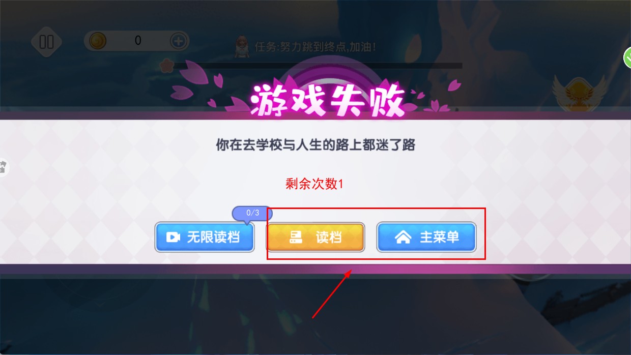 4、游戏失败时点击【读档】继续挑战,或选【主菜单】返回,合理利用剩余次数重试。
