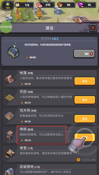 3、在建造界面选择【哨塔】建造,利用其远距离攻击特性,为营地建立基础防御阵线抵御丧尸进攻。