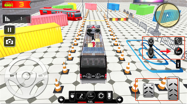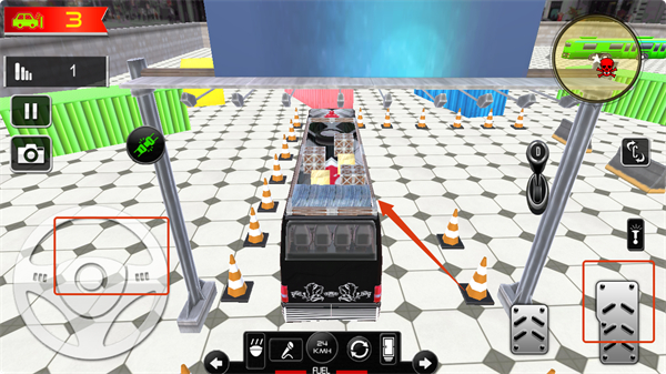 3、先用右侧的钥匙启动车,换挡和油门刹车,操控巴士在停车场中避开障碍物,精准停车。