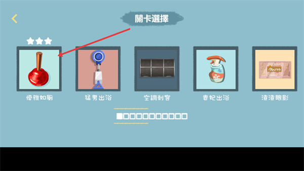 2、在关卡选择页面点击目标关卡(如【優雅如廁】),进入该场景的清洁操作界面。