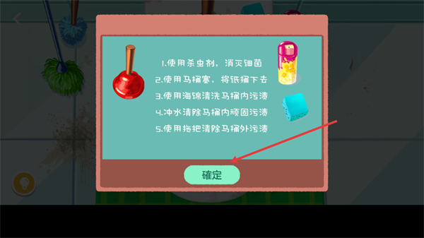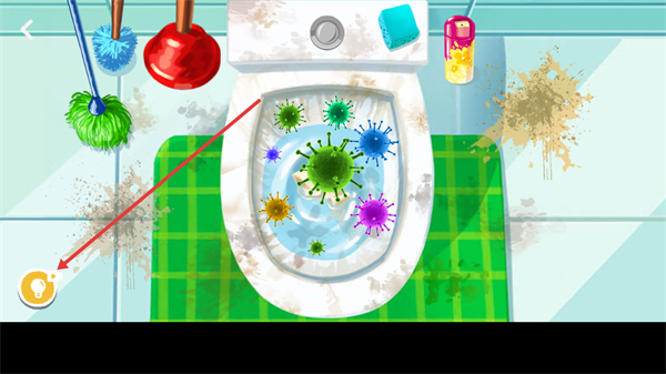 3、进入清洁场景后,可看到待清洁的区域(如马桶)及相关污渍、细菌,准备按步骤进行清洁操作。
