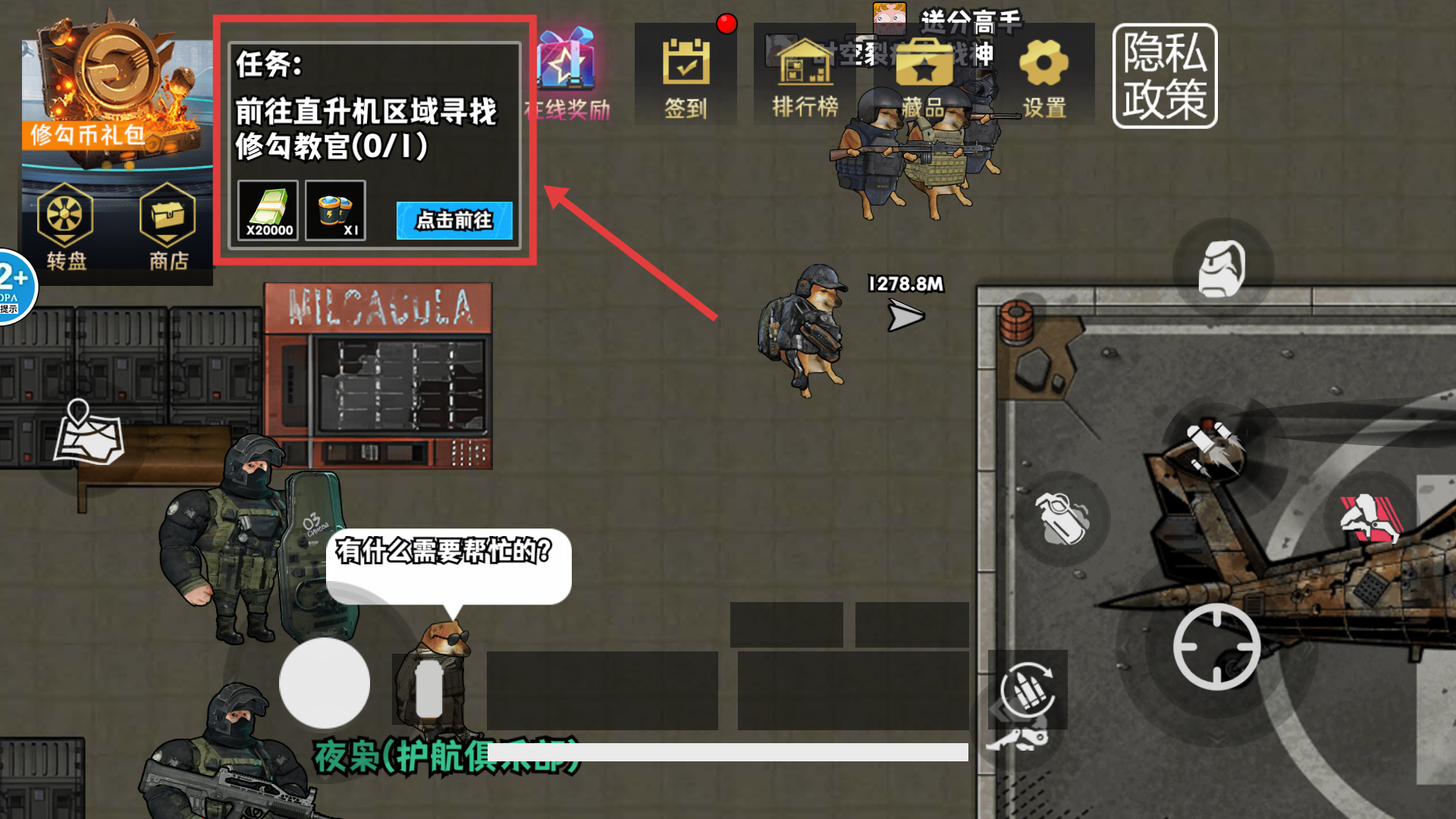 1、点击【点击前往】按钮前往直升机区域寻找修勾教官,完成任务可获取【20000】货币与物品奖励,推进游戏进程。