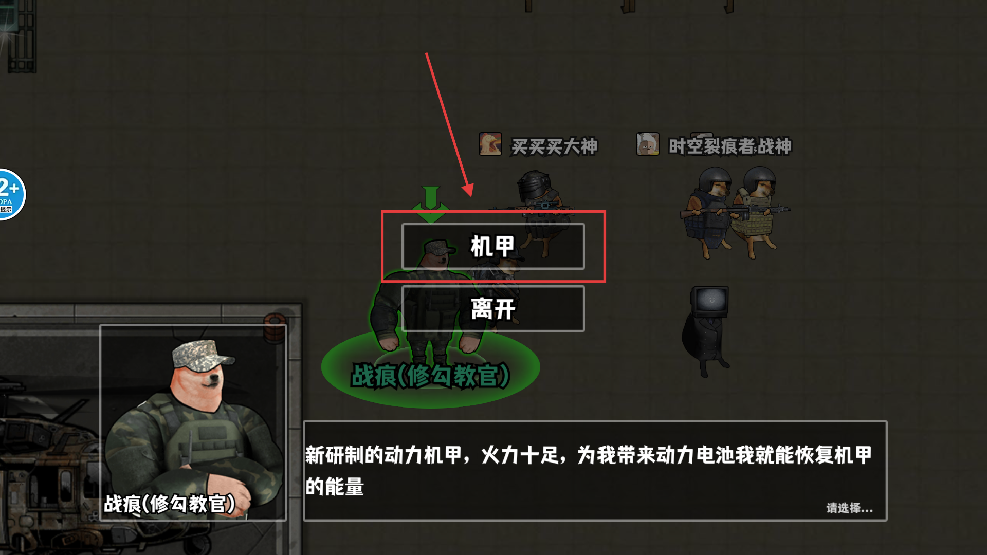 2、与战痕教官交互时选择【机甲】选项,利用机甲的高防御与火力提升生存能力,助力后续战斗与资源收集。
