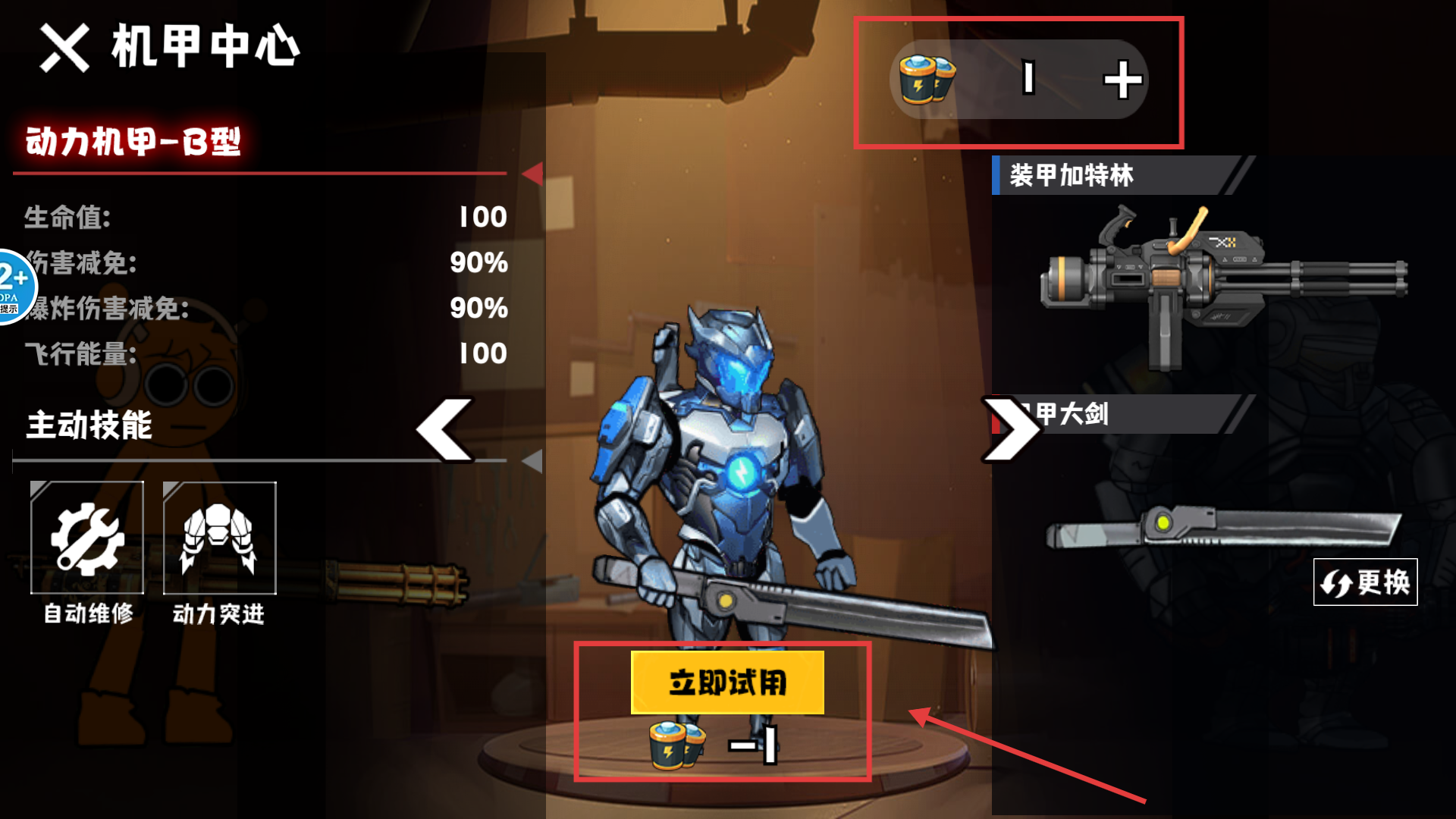 3、在机甲中心消耗电池激活【动力机甲-B型】,试用其技能与装备,增强战斗能力以应对危险环境。