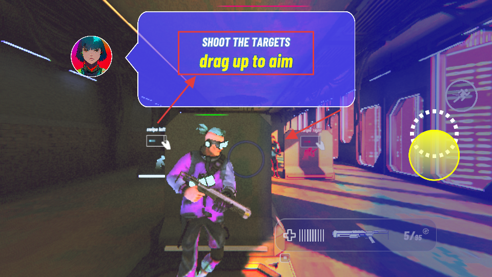 3、面对目标时,向上拖动屏幕瞄准,用武器射击目标,完成【SHOOTTHETARGETS】训练,提升射击技巧。