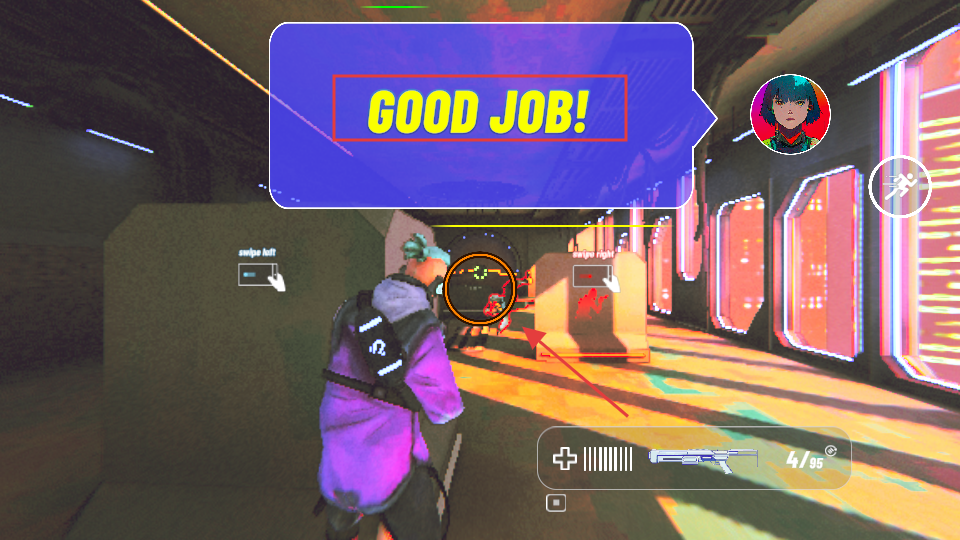 4、击中敌人后收到【GOODJOB】反馈,继续瞄准射击剩余敌人,赢取胜利以推进游戏的后续任务。
