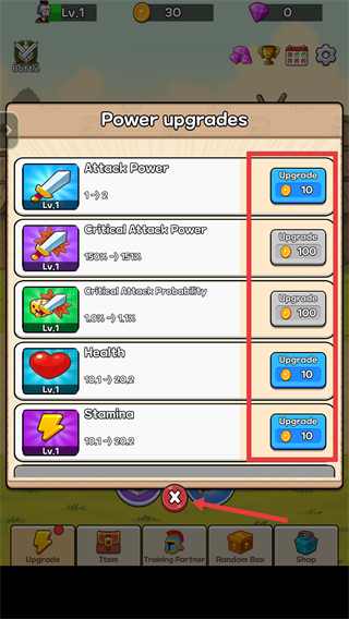 2、进入【Power-upgrades】界面,点击【Upgrade】按钮消耗金币,提升【Attack-Power】等属性,增强战力。