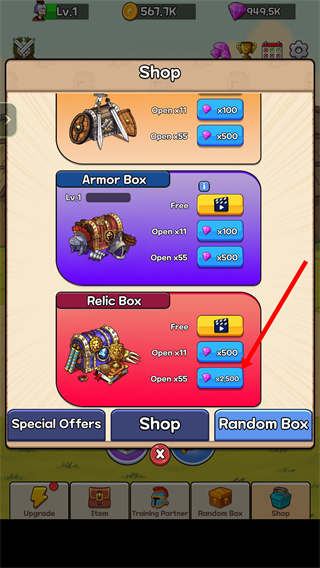 3、在【Shop】界面选择【Relic-Box】,消耗钻石开启宝箱,获取道具资源助力角斗士养成。