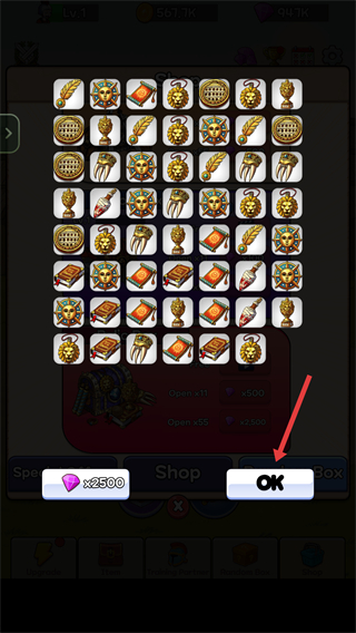 4、开启宝箱获得道具后,点击【OK】按钮确认领取,积累资源以提升角斗士的对战能力。