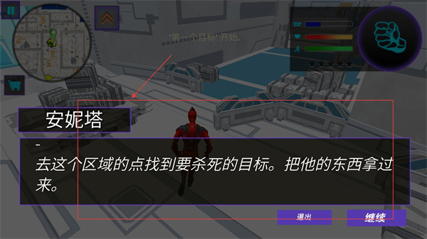 2、接收【安妮塔】的任务指令,明确需前往指定区域击杀目标并夺取物品,点击【继续】按钮推进剧情,进入任务执行阶段。