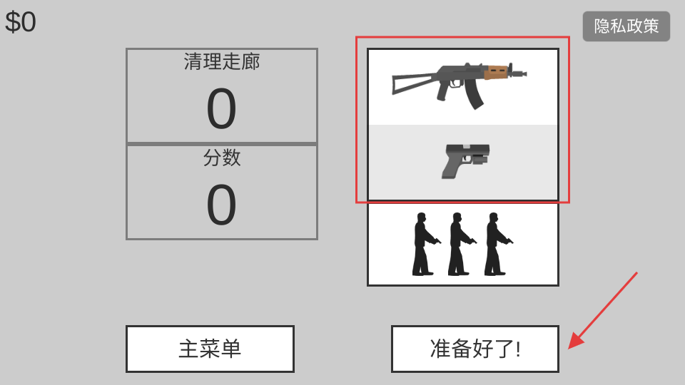 2、在武器选择界面选好【步枪】或【手枪】后,点击【准备好了】按钮,进入清理走廊的战斗任务。