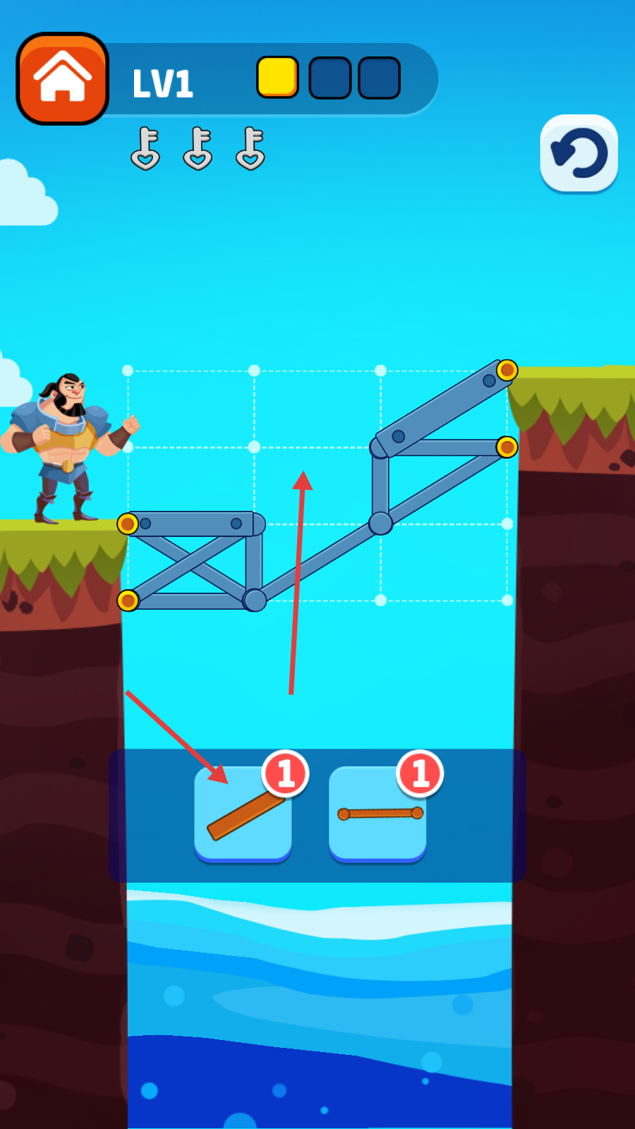 3、在“LV1”关卡中,从下方选择木板,放置到合适位置搭建桥梁。