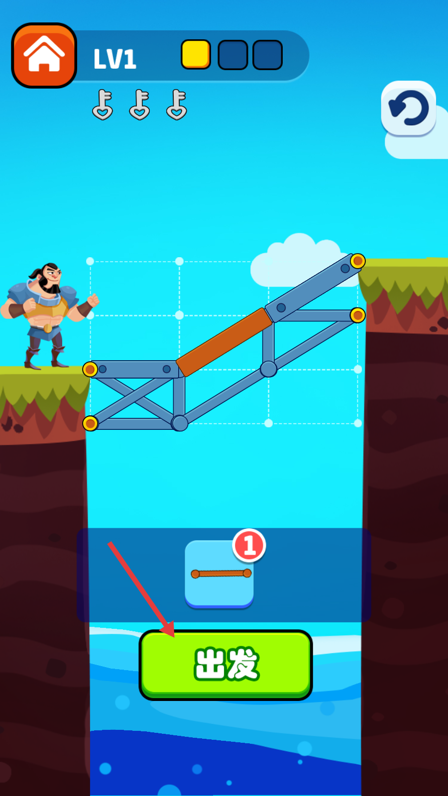 4、桥梁搭建完成后,点击【出发】,让角色通过桥梁。