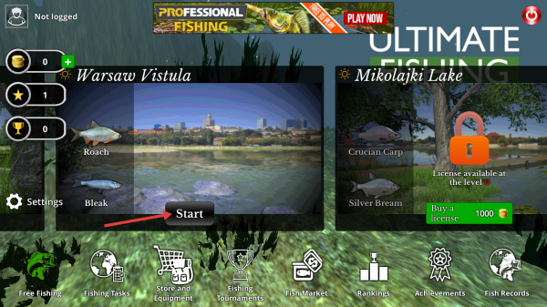 1、点击【Start】进入【Warsaw-Vistula】水域的钓鱼场景,开启该区域的钓鱼活动进程。