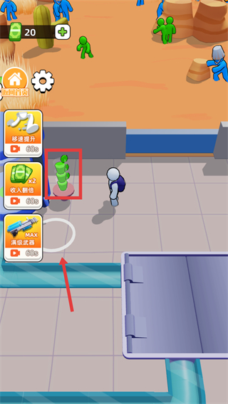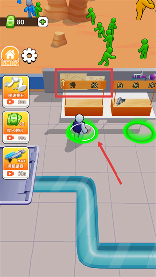 4、拾取完钞票后,操控角色移动至【升级】处进行升级。