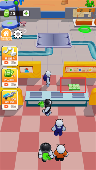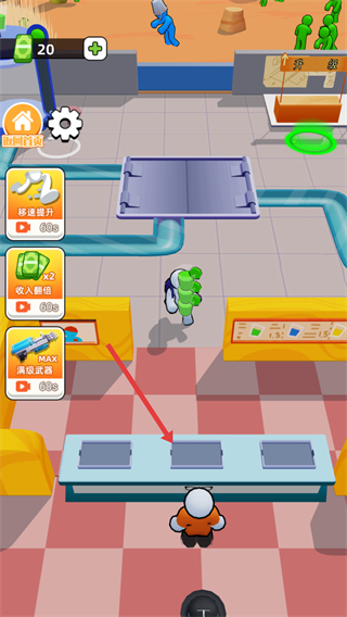 2、将收集到的资源运送到红色箭头指向的吧台,进行售卖。
