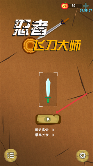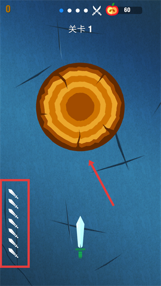 2、在【关卡1】中,点击红框内的飞刀,向旋转的木靶投掷,避免与已插飞刀碰撞,积累得分。