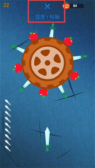 3、投掷飞刀命中【怪兽·轮胎】靶,同时收集靶上的苹果,提升得分与道具数量,推进关卡。