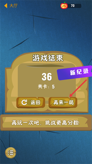 4、游戏结束后点击【再来一局】,重新挑战以突破【36-得分】的新纪录,冲击更高关卡。