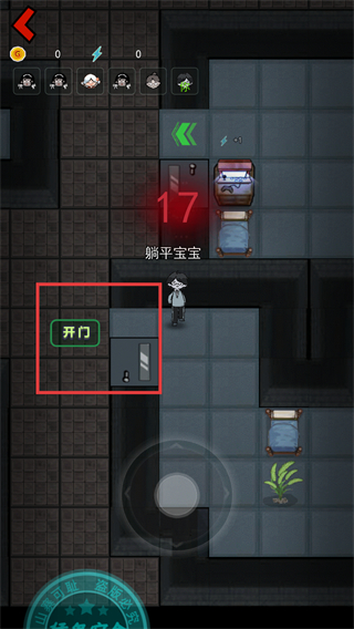 3、在游戏场景中找到开门按钮,点击后进入对应房间,利用躺平宝宝的提示推进游戏进度。