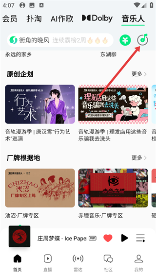 1、打开QQ音乐,在音乐人页面点击右上角的【听歌识曲】图标哦。