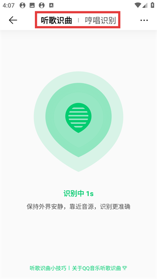 2、进入页面后,选择【听歌识曲】或【哼唱识别】模式呀。