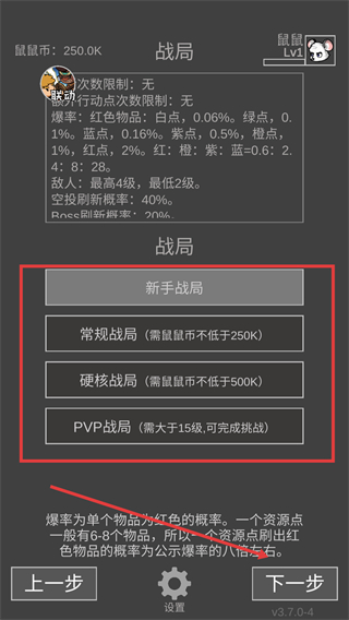 1、战局界面显示物资概率、敌人等级等信息,根据鼠鼠币数量选择战局250K可选“常规战局”,点击对应选项进入战局。