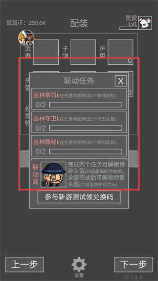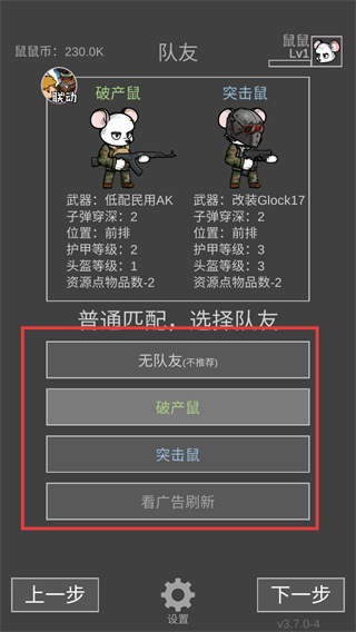 3、队友匹配界面可选择“破产鼠”“突击鼠”,不同队友有不同武器、护甲配置,按需选择以增强团队战力。