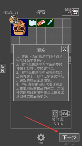 4、搜索界面需按规则操作物品双击快速存背包、旋转按钮转物品、垃圾桶删除物品,当前搜索总价值5.01K,点击“下一步”继续。