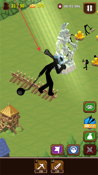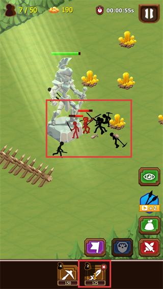 3、指挥【锤子】火柴人优先攻击敌方核心雕像,利用高爆发伤害快速削弱敌方战力缩短战斗时间。