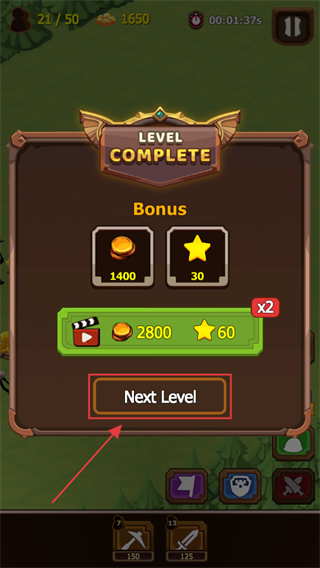 4、通关后点击【NextLevel】按钮进入下一关,可选择观看视频获取双倍奖励积累更多资源。