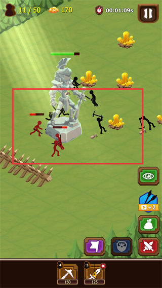 4、派遣多个火柴人单位围攻石像敌人,利用数量优势分散敌人攻击,同时持续补充新单位保持战斗力。