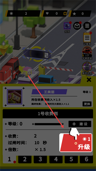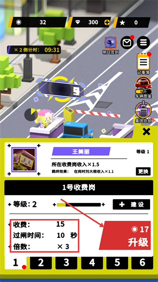 1、点击【升级】按钮提升1号收费岗等级,可增加收费、缩短过闸时间,同时员工王美丽能让所在收费岗收入×1.5,助力收益增长。